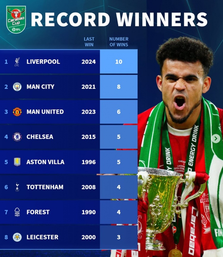 3月16日讯 利物浦即将迎来同纽卡的联赛杯决赛,官方数据统计显示总计有23支不同的俱乐部在迄今为止举行的61届联赛杯决赛中夺得冠军,红军是该项赛事夺冠次数最多的球队。
