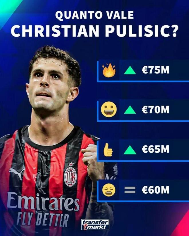 德国转会市场预热普利西奇的身价变化,最高可能达到7500万欧元。
